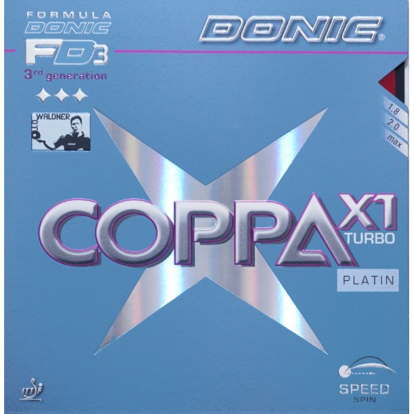 Donic Coppa X1 Turbo (Platin) je nový potah určený hlavně na topspinovou hru dále od stolu. Rychlý, extrémně točivý potah se středně tvrdou houbou, další z nástupců oblíbené řady potahů Coppa.